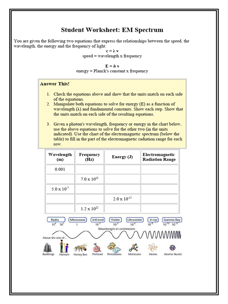 Analysis of Spectroscopy Concepts and Calculations from a Quiz on Light Light Calculations Practice Worksheet energy, wavelength, and frequency practice problems. What is the frequency of yellow light, l = 540 nm ? chapter 7 wavelength, frequency, speed & energy practice worksheet. study with quizlet and memorize flashcards containing terms like calculate the wavelength given the frequency of radiation is 6.10 x. Energy, frequency, wavelength and the photoelectric effect. These problem sets. Light Calculations Practice Worksheet.
